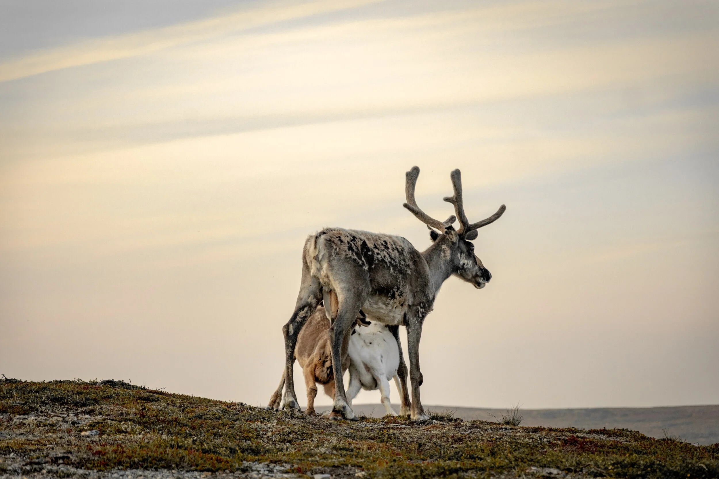 Fra 10.mai - 10. juni gjeter vi flokken under kalvingen for å forebygge reintap til rovdyr som ørn, bjørn, jerv, gaupe og til og med kråker og ravn. I området der vi kalver flokken er det viktig å vise respekt både til dyr og natur, så her ferdes vi stille og rolig. Dette er et stort område, over én mil i omkrets, så simlene vil trekke seg litt unna under selve kalvingen, men vil returnere tilbake til hovedflokken en tid etter at kalven er født.